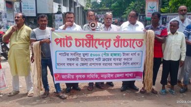 August 27, 20230প্রতিমণ পাটের মূল্য ৫ হাজার টাকা করার দাবিতে মানববন্ধন।